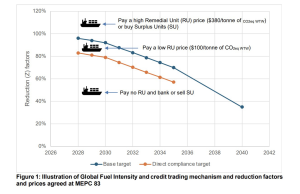 Bruttovetoisuudeltaan yli 5 000 alusten ”päästömaksut” arvioidaan kahden päästökriteerin perusteella, joista tiukemman (suora vaatimuksen mukainen tavoite; Direct complience target) ylittämisen maksu on 100 US dollaria ja matalamman (perustason tavoite, Base target) 380 US dollaria hiilidioksiditonnia kohden (kuva 1).