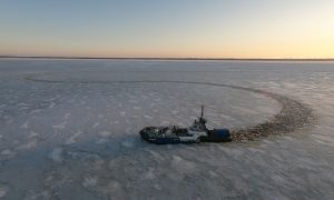 Kokeissa olivat vastakkain kylmän talven karaisema Saimaan syväväylä ja teknologinen ihme, jäätä murtava irtokeula Saimaa. Kuva: Ilari Rainio / Väylävirasto.