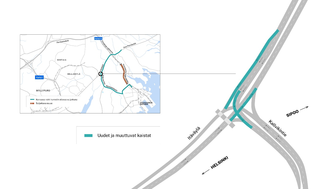 Vuosaaren tietunnelin varareitin parannukset on saatu valmiiksi, ja reitin toimivuutta testataan 16.6. klo 22–18.6. klo 22. Reitti kulkee Itäväylältä Kallvikintien ja Niinisaarentien kautta Vuosaaren satamaan. Testauksen tarkoituksena on varmistaa, että myös rekat voivat käyttää reittiä ongelmitta tunnelissa myöhemmin tänä vuonna alkavan saneerauksen aikana. Vuosaaren tunneli suljetaan liikenteeltä testauksen ajaksi, ja kaikki liikenne ohjataan varareitille. Itse testauksesta ei aiheudu liikenteelle haittaa varareitillä.